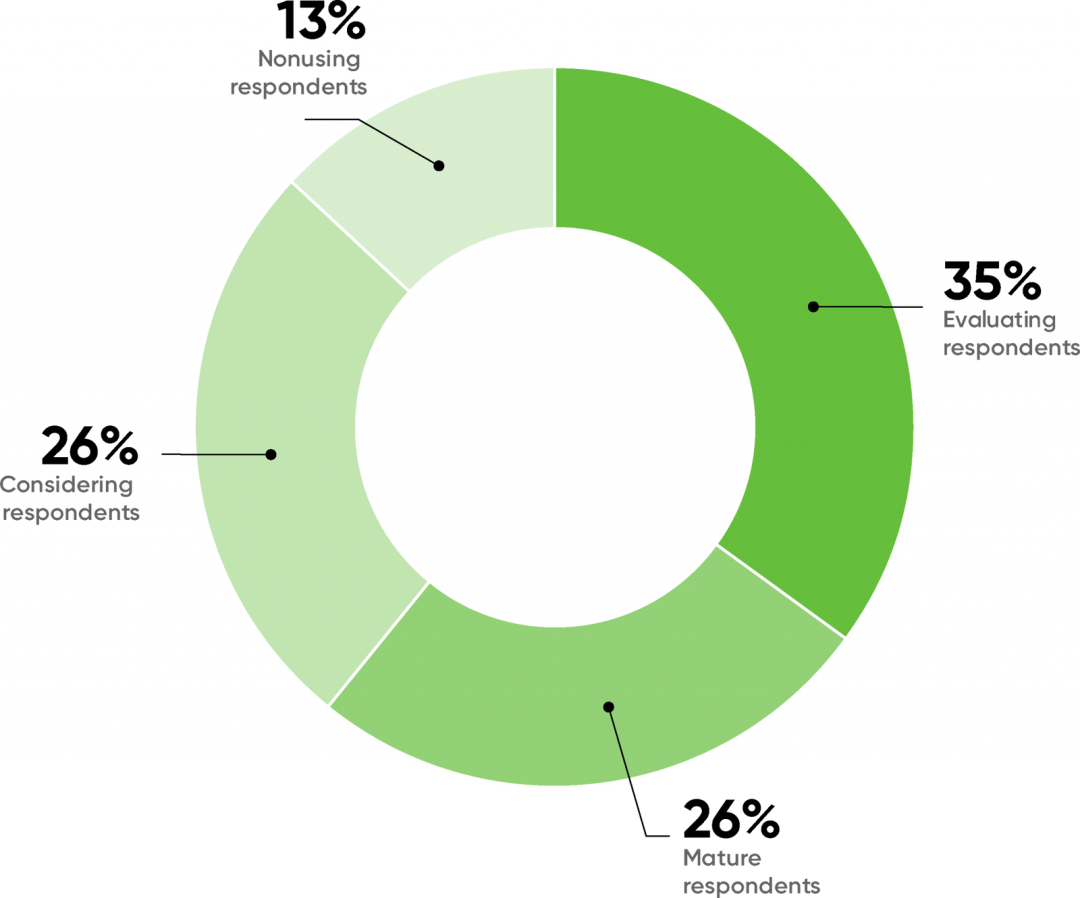 O'Reilly 在《2021 年企业人工智能应用报告》中使用这个引人注目的饼状图说明了这一点,该饼图显示,只有四分之一的受访者表示他们已经成熟部署了人工智能技术。