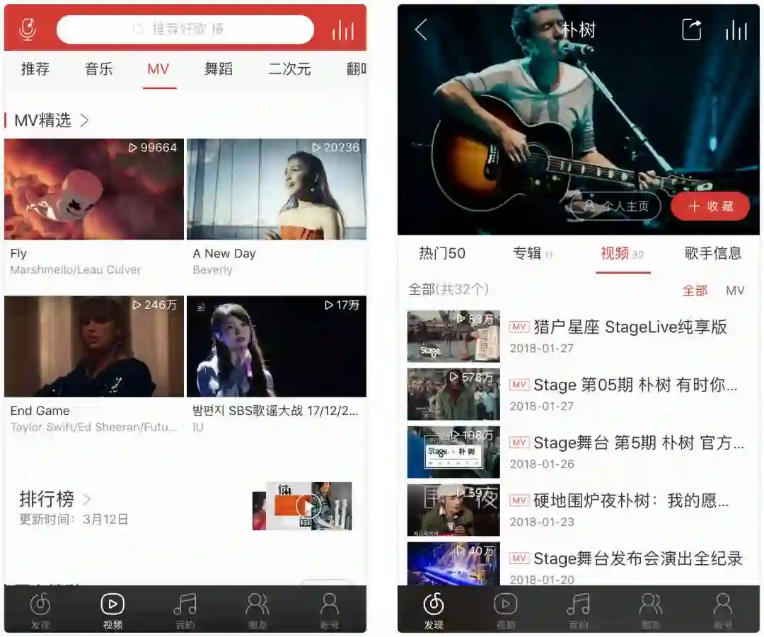 除了在首页中,在 MV 页面、发现页面推送的也会有那些你「特别关注」的音乐人。在歌手的个人详情界面中可以选择视频选项,这里除了他的个人 MV,还能看到许多相关演唱会的视频以及独家专访的栏目。随着网易云音乐和更多音乐人的合作,你应该可以看到他们「更全却又不一样的一面」。