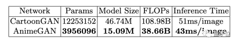 与CartoonGAN相比,可以明显看出AnimeGAN参数更少,模型更小,计算量更少,推理速度更快,是一个相对轻量级的GAN。