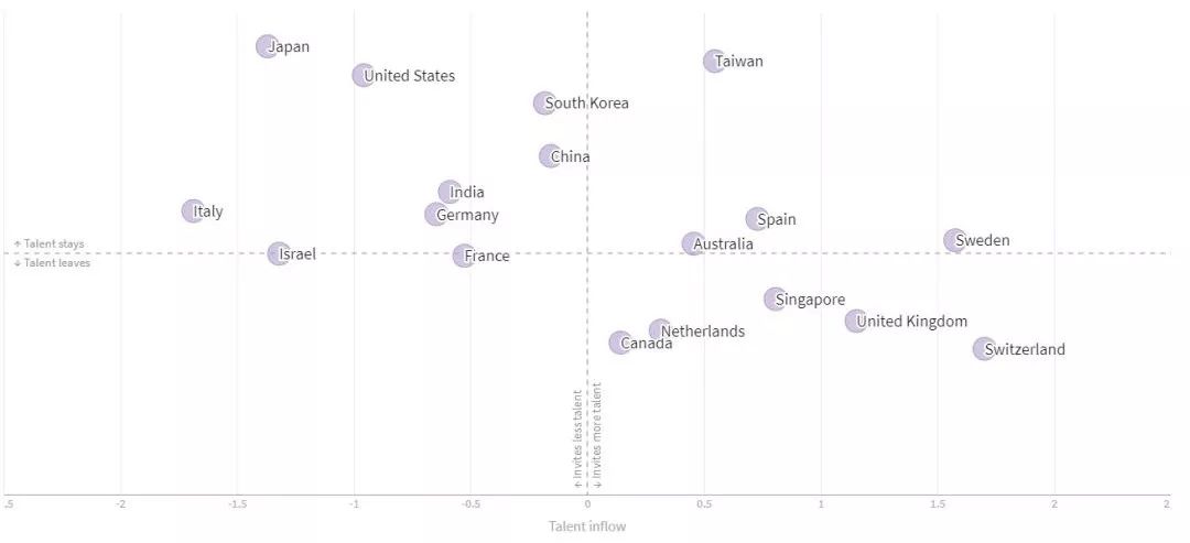 “AI人才吸引国”:位于图中右上角的是澳大利亚、西班牙、瑞典和中国台湾地区,该区域表示这些国家的AI人才呈净流入趋势,说明这些国家或地区在吸引外来人才和留住本国(或本地区)的AI人才上方面都具有优势。