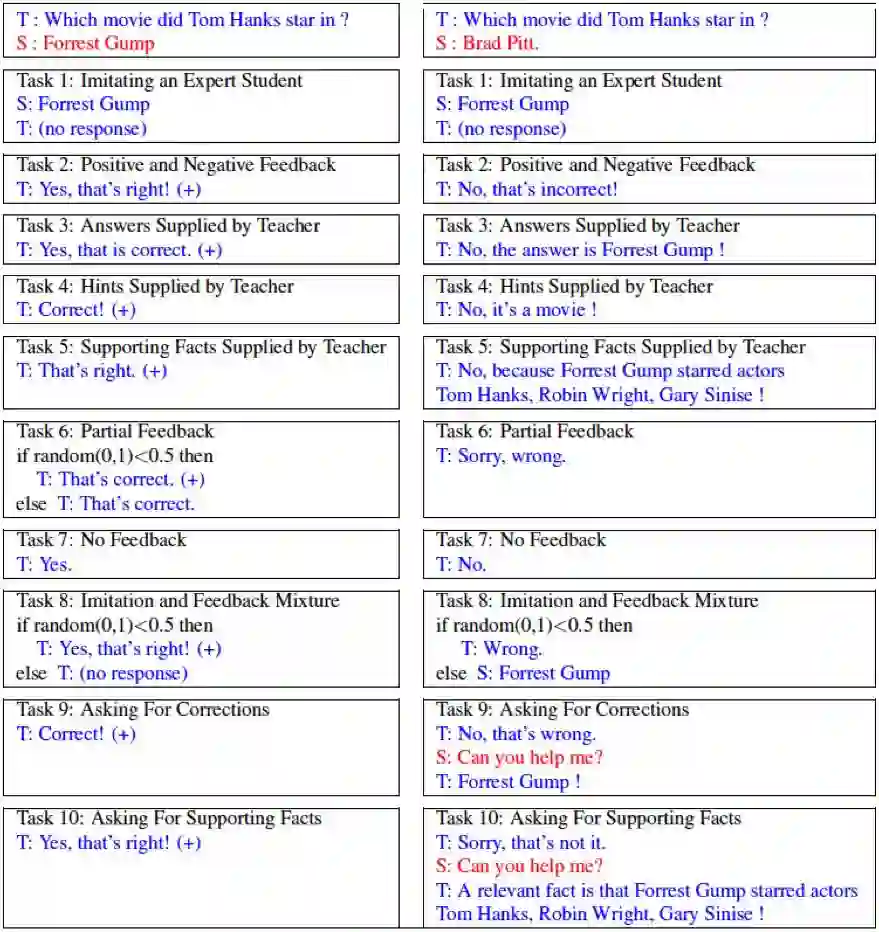 图 8.1:我们的模拟器实现的 10 个任务,其中评估了不同类型的应答和互反的反馈。每一个案例中给定 WikiMovies 中的例子,其中左侧学生(机器)全部回答正确,而右侧学生全部回答错误。学生的应答用红色文本表示,学生用 S 表示,教师的反馈用蓝色文本表示,而教师用 T 表示。为了模仿学习过程,教师需要提供学生(以 S 表示)在任务 1 和 8 中做出的应答。(+)表示一次正面奖励。
