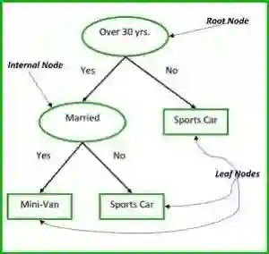 图3中的决策树根据年龄和婚姻状况分类是否会购买跑车或小型货车。如果这个人已经超过30岁,没有结婚,我们就像下面这样沿着树走:“30多岁吗?”- >是->结婚了吗?最后,该模型输出结果是一辆跑车。