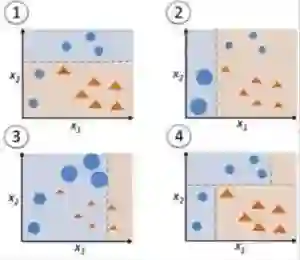在图8中,步骤1、2和3涉及一个称为决策树桩的弱学习器(一级决策树,其基于仅一个输入特征的值进行预测;决策树的根立即连接到其叶)。构建弱势学习器的过程一直持续到用户定义数量较弱的学习器已经建成,或直到训练没有进一步改善。步骤4组合了先前模型的3个决策树(因此在决策树中有3个分割规则)。