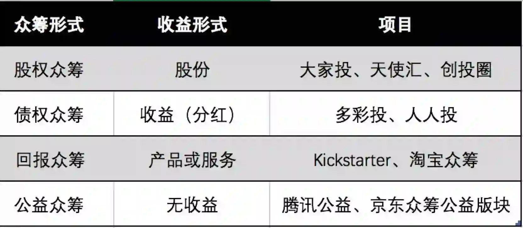 在回答上面的问题之前,我们不妨先来了解下众筹的分类以及各自的营盈利方式。按照咨询公司Massolution的分类,众筹可以分为股权众筹、债权众筹、回报众筹以及公益众筹。