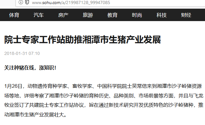 2018年1月31日,搜狐发布的一则《院士专家工作站助推湘潭市生猪产业发展里》的新闻