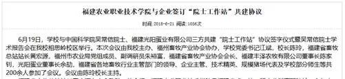 2018年6月21日,福建农业职业技术学院的网站发布福建农业职业技术学院与企业签订 “院士工作站” 共建协议》的新闻