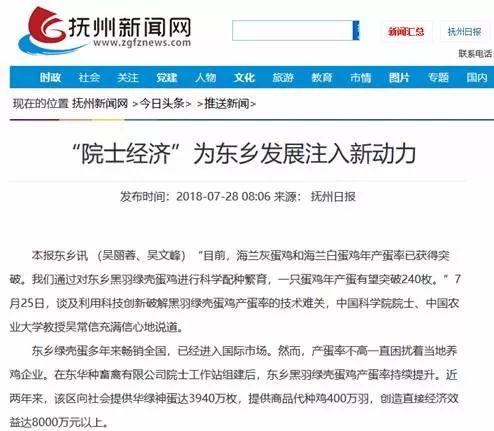 2018年7月28日,江西抚州新闻网发表的一篇《 “院士经济” 为东乡发展注入新动力》的文章