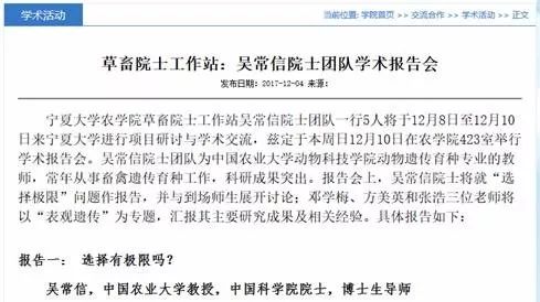 ,我们可以知道吴院士在宁夏大学农学院也建立了一个草畜院士工作站,而且他本人和他带领的团队将于2017年12月8日到这个工作站做学术报告。