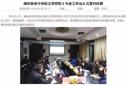2018年1月26日,牧通人才网发表了《湘佳牧业中科院吴常信院士专家工作站正式签约挂牌》的文章