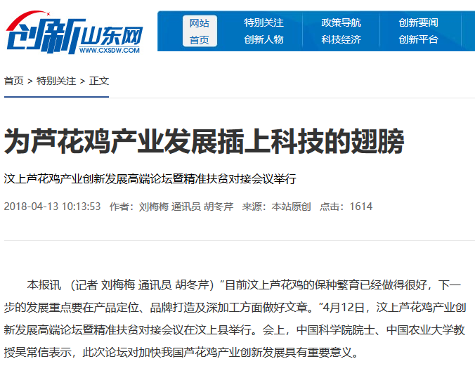2018年4月13日,创新山东网发布了一条《为芦花鸡产业发展插上科技的翅膀》的新闻
