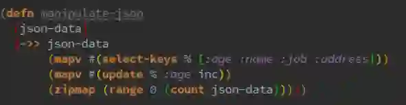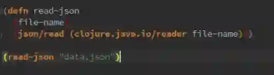 在 Clojure 里面有一个 json,因为动态语言的关系相当的简单,完全没有废话。这个函数我觉得哪怕是不写 Clojure 的,这个也是应该很能读的懂的。首先有一个 Java 的 Reader,是 FileReader,这个 Reader 被传递到了这个 json 的函数里面,读出来文件内容,读到 Map 里面,但是读完之后,你知道数据长什么样吗?不知道,下次换一个 json 文件,同样的函数可以同样读,但是你不知道读出来是什么东西。讲到这里就已经有一点难度在里面了。