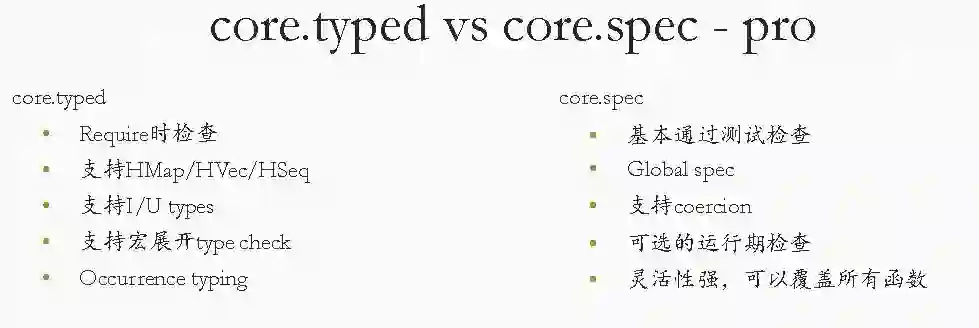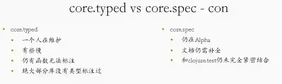我的脑子喜欢 core.spec,因为有前景。我的内心喜欢 core.typed,因为给东西加类型写起来真得很过瘾。