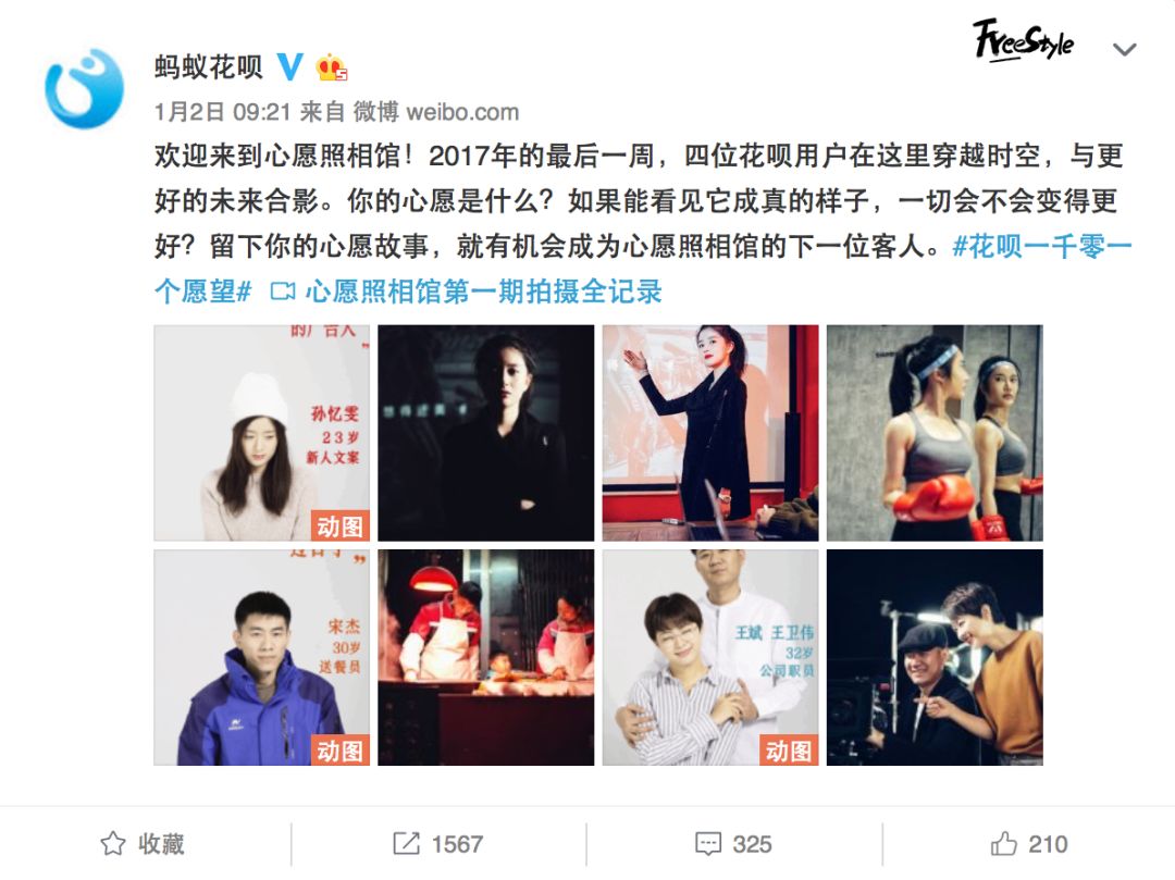#花呗一千零一个愿望#是花呗倾力打造的活动之一,花呗为此特地挑选“心愿大使”,筛选用户的心愿,不断沟通磨合,希望真正帮到用户。1月初,【心愿照相馆】上线,花呗帮助4位用户“变成了”自己梦想的样子,而燕子的这次跨越1800公里的异地求婚,也是整个活动的高潮。