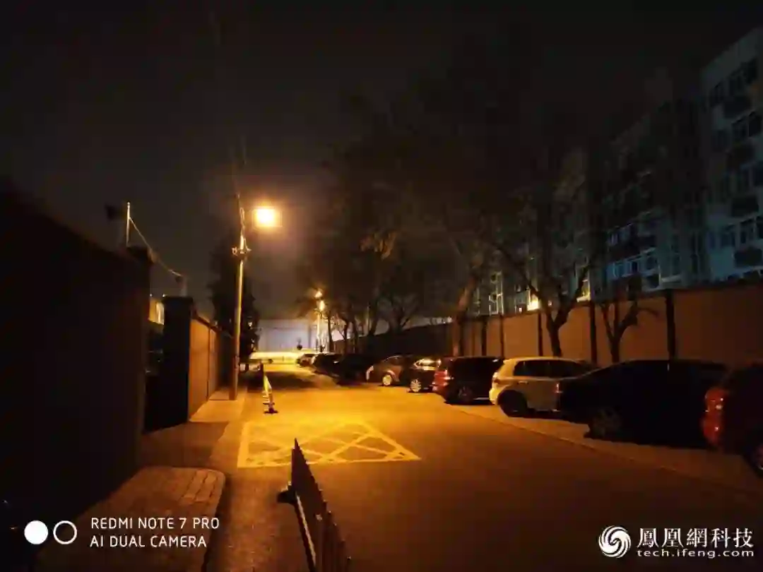 夜晚暗光情况下,AI相机会智能识别夜晚模式,增加画面亮度,成像时速度很快,对焦也没有拖沓感,但成片亮度仍较低,对高光的抑制也不理想,但好在Redmi Note 7 Pro支持手持超级夜景模式。
