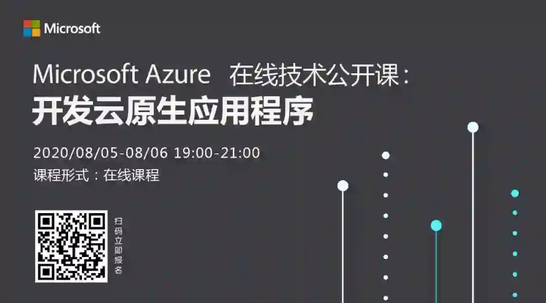 # 微软在线公开课# 开发云原生应用程序,08.05-08.06 19:00 - 21:00 两天,您将学习到:端到端云迁移路径,云架构优化本地部署流程,深入学习前端 web 应用程序,后端 web 服务,数据库以及移动应用程序的快速自动化部署。扫描下图二维码或者点击阅读原文链接立即报名参加。