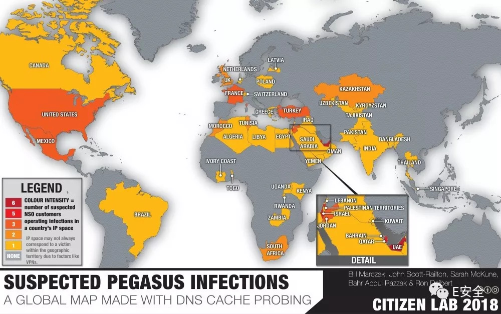题记:2017年四月,E安全报道过 Pegasus 是世上最危险的手机间谍软件,今天再次报道,是因为加拿大多伦多大学公民实验室于9月18日发布了一则关于它的最新分析报告,该实验室一直在追踪该软件,于2016年就已经发布过相关报告,当时报告重点是该软件利用 iOS 多年存在的三个零日漏洞,逐步精巧的拿下并控制苹果手机的过程。该软件由以色列一家名叫 NSO 的公司开发,该公司市值近10亿。这样一款处于灰色地带的非法间谍软件,精心包装在一个合法的公司壳内,该公司宣称该软件只卖给政府机构,用来打击恐怖分子和预防犯罪。如同当年的木马软件,强调自己的远控功能,是为了让网络管理员们更方便的远程管理一样。但是,间谍软件和木马软件最终一样泛滥成灾,从最初的美好愿望(合法化包装),到背离初衷,Pegasus已经染指全球45个国家。作为一家商业化运营的公司,追求利润最大化毋庸置疑,销售更多拷贝可以让公司活得更好,所以单销售给政府机构用于反恐恐怕利润不够,走入巨大的民用市场才能让其财富呈几何级数增长。和 Pegasus 同样知名的还有 FlexiSPY,以及 FinSpy。这些间谍软件在民用市场中的玩法,其中有一个热门的应用场景,夫妻之间用于监控伴侣,软件可收集监听语音通话、短信、社交软件等等数据。灰色软件从最初的正义面目到歪楼,从光明坠入到无边黑暗,一切皆在意料之中。