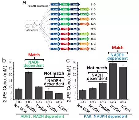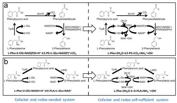 从苯丙酮酸合成苯乙醇的代谢途径需要共底物α-酮戊二酸(2-oxoglutarate)和还原力 (NAD(P)H)的参与,α-酮戊二酸的供应不足和还原力平衡问题是限制苯乙醇产量进一步提高的重要瓶颈。针对辅因子供应和循环问题,该研究以大肠杆菌为底盘,通过在合成系统中利用谷氨酸脱氢酶设计一个“桥梁”,构建辅因子自平衡的细胞工厂,无需外源添加任何辅因子,细胞催化效率提高近4倍,实现了苯丙氨酸高效转化生成具有玫瑰香的苯乙醇。