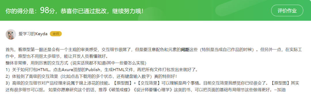 第一次临摹,我有5个复杂的交互设计做不出来,但是当我通过网上搜索,以及听完keyda老师的讲解,我第二次临摹只剩下3个复杂交互做不出来。最后一次临摹开始的时候,我又重新百度了下网上的方法后,3个中的2个被我做出来了,剩下的最后1个在请教黄老师后也做出来了,在这里也要感谢黄老师的耐心讲解,最终我的临摹作业以98分的优异成绩位列第一。
