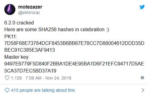 当然,在任何猫捉老鼠游戏中,许多人都在等待黑客对最新的发展做出最快的响应。看上去6.2.0更新的修补工作并不是很有效,很快黑客就只用了几天的时间证明该版本被成功破解,同时还在Twitter秀了一把密钥。