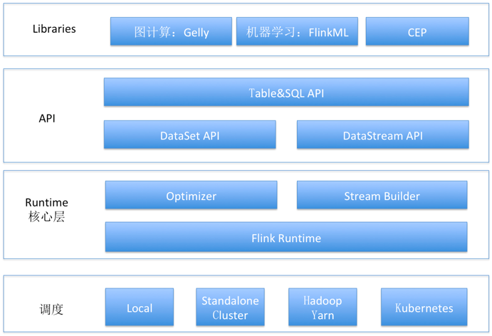 API层面稍后单独用一个模块讲解,在Library方面内置了图计算算法包Gelly和机器学习包FlinkML以及CEP。其中Gelly和FlinkML是基于DataSet API进行开发的,而DataSet API是一个离线批计算的接口,所以本质上Gelly和FlinkML并没有发挥Flink这个天然流式框架的优势。个人觉得,Flink作为Apache相对比较年轻的开源计算框架,对于一些组件化的支持还不完善,相比于Spark生态还有比较大的差距。后续如果能基于Flink Stream API开发出流式的上层应用,会成为Flink的一大亮点。