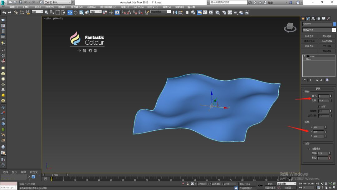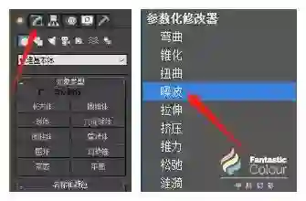 接下来打开修改器,找到参数化修改器的【噪波】命令,调节合适的噪波比例和强度,使片面产生一定程度的起伏。如图3、图4所示。