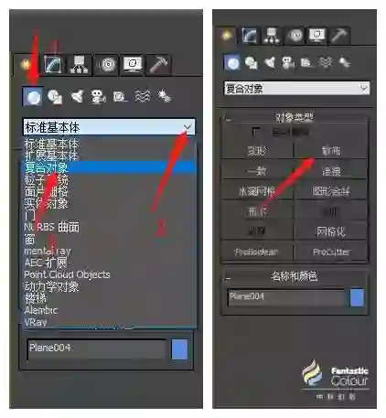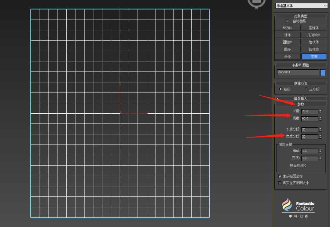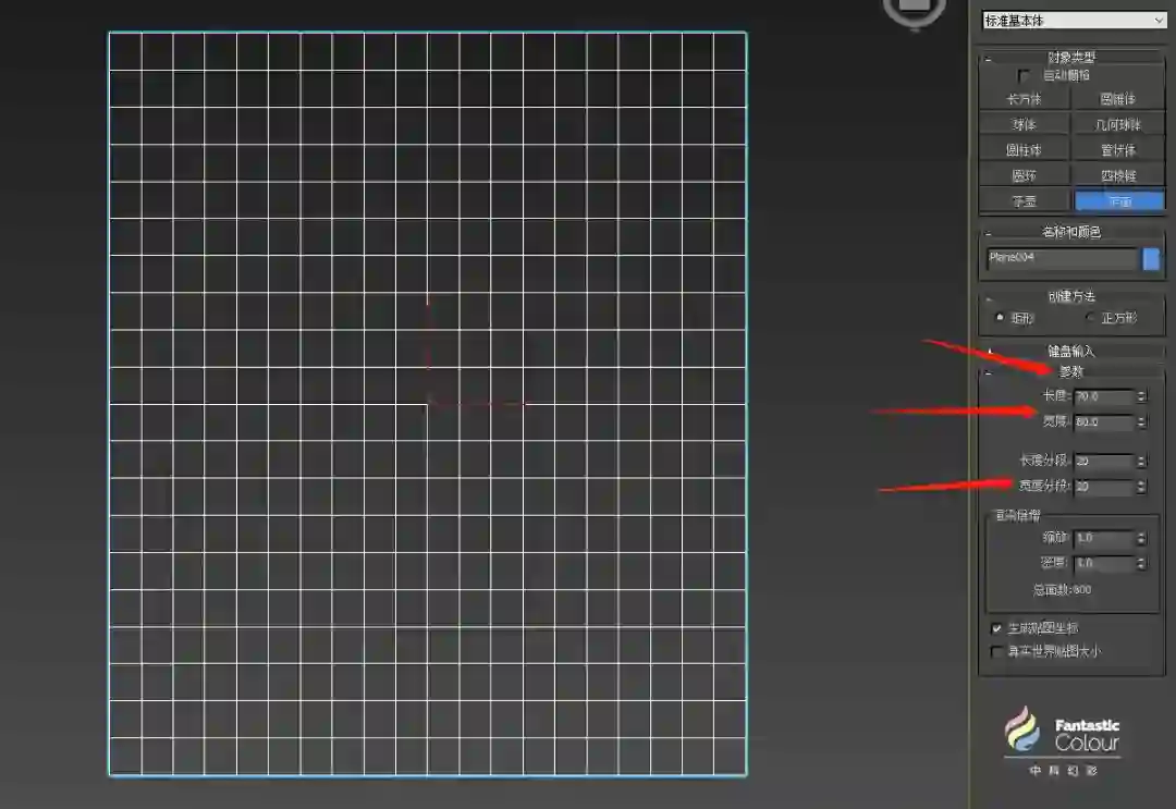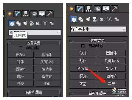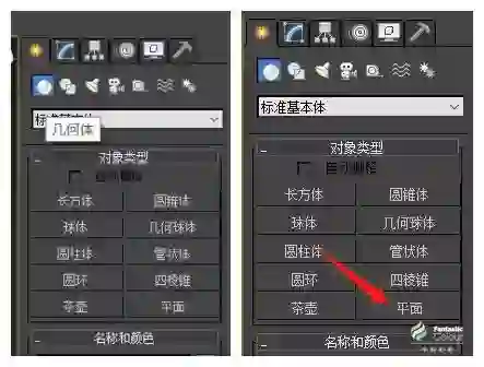 首先打开3D软件,找到【几何体】,找到文字中的平面选项,鼠标按左键选择【平面】,在视图中创建平面。如图1所示。