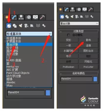 开始运用【散布】的命令操作,选中面片点击【散布】,然后拾取分布对象选中球体。(首先选中平面点击散布命令之后选中球体点击拾取分布对象)然后根据自己的需求在修改面板中的源对象参数进行调整。如图7、图8所示。