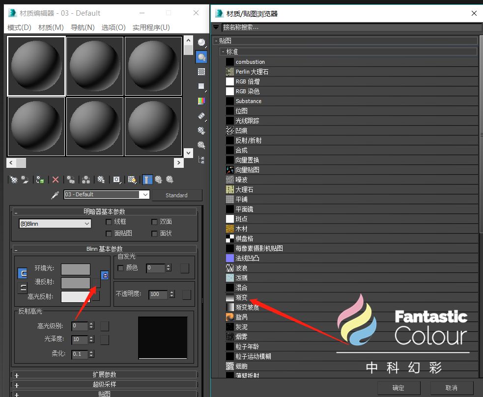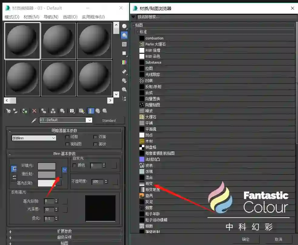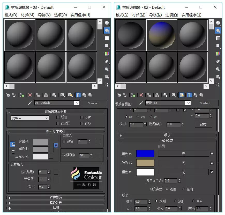 打开材质编辑器(M),在漫反射贴图通道中选择渐变,渐变参数中改变#1、#2、#3的RGB值,把该材质赋予物体上,调节UVW贴图(这个地方需要注意UVW贴图在修改器里可以找到,反复去调整,直到效果最佳),使物体更加美观。如图9、图10、图11所示。
