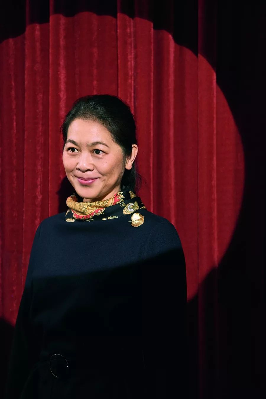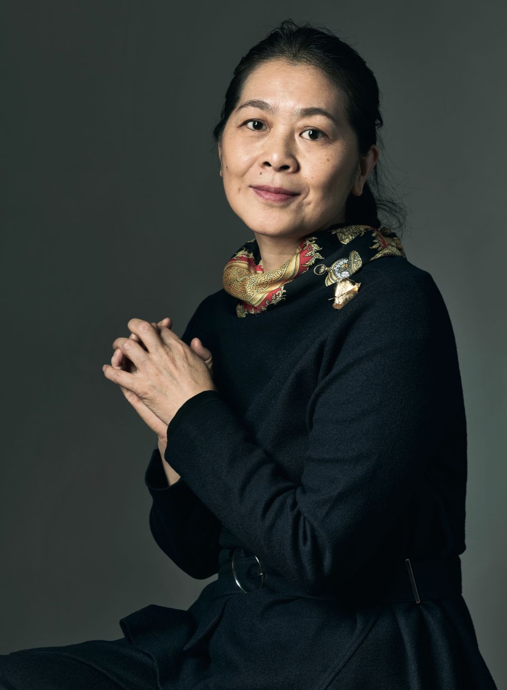采访第二天要拍照,迟子建带了一个小小的绸面的化妆包,化妆包上绣着几朵小花儿,她依然爽朗地笑着,对着摄影师大呼上当,但仍旧咬牙配合着。这天她穿一套很精致的深蓝色绒面套装,深蓝色是她喜欢的颜色,会让她想到故乡的夜空。脖子上系一条橘色花纹的爱马仕丝巾,丝巾一侧,她还别上一枚金黄银杏叶型的胸针,丝巾和金色胸针点亮了深蓝色的沉闷。