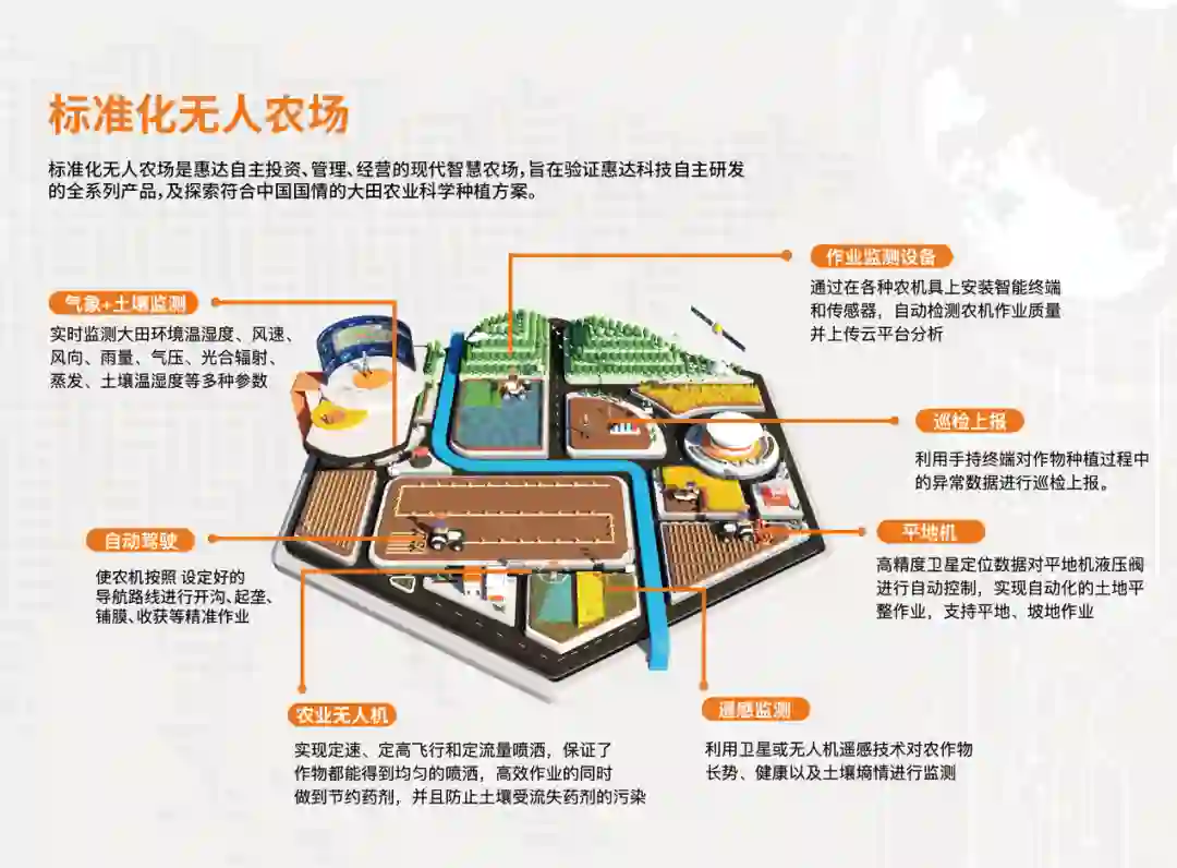 惠达科技将人工智能、物联网、互联网、自动驾驶、无人机等领域的前沿技术与智慧农业相结合,为国内农业一线的终端用户提供领先的产品及大田种植整体解决方案,整合多种信息技术手段助力集约农业经营者及各级农户提升生产效率和管理水平。