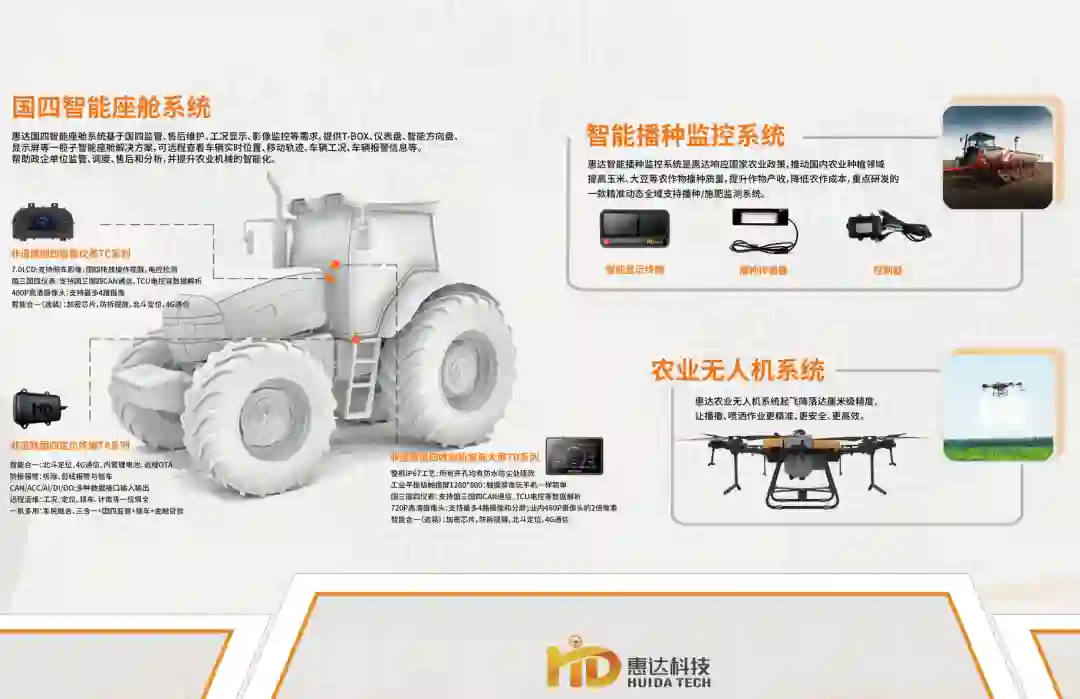 惠达科技的产品及解决方案矩阵包括:农机作业智能探测产品、农机自动驾驶产品、无人农机产品、农用无人机产品,在农业车联网领域,以软、硬件和大数据于一体的车联网综合解决方案。