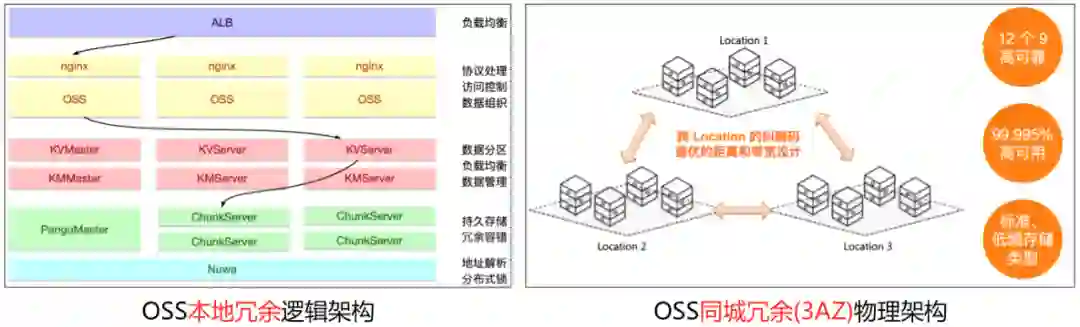 同城冗余存储(3AZ)则是在物理架构上是提供机房级别的容灾能力,将用户数据副本分散到同城多个可用区。当出现火灾、台风、洪水、断电、断网等灾难事件,导致某个机房不可用时,OSS 仍然可以提供强一致性的服务能力。故障切换过程用户业务不中断、数据不丢失,可以满足关键业务系统对于 RTO(Recovery Time Objective)和 RPO(Recovery Point Objective)为 0 的强需求。同城冗余存储,可以提供 99.9999999999%(12 个 9)的数据设计可靠性以及 99.995% 的服务设计可用性。