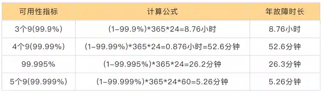 网络服务的可用性,通常会折算为不能提供服务的故障时间长度来衡量,比如典型的 5 个 9 可用性就表示年故障时长为 5 分钟,如下表所示。