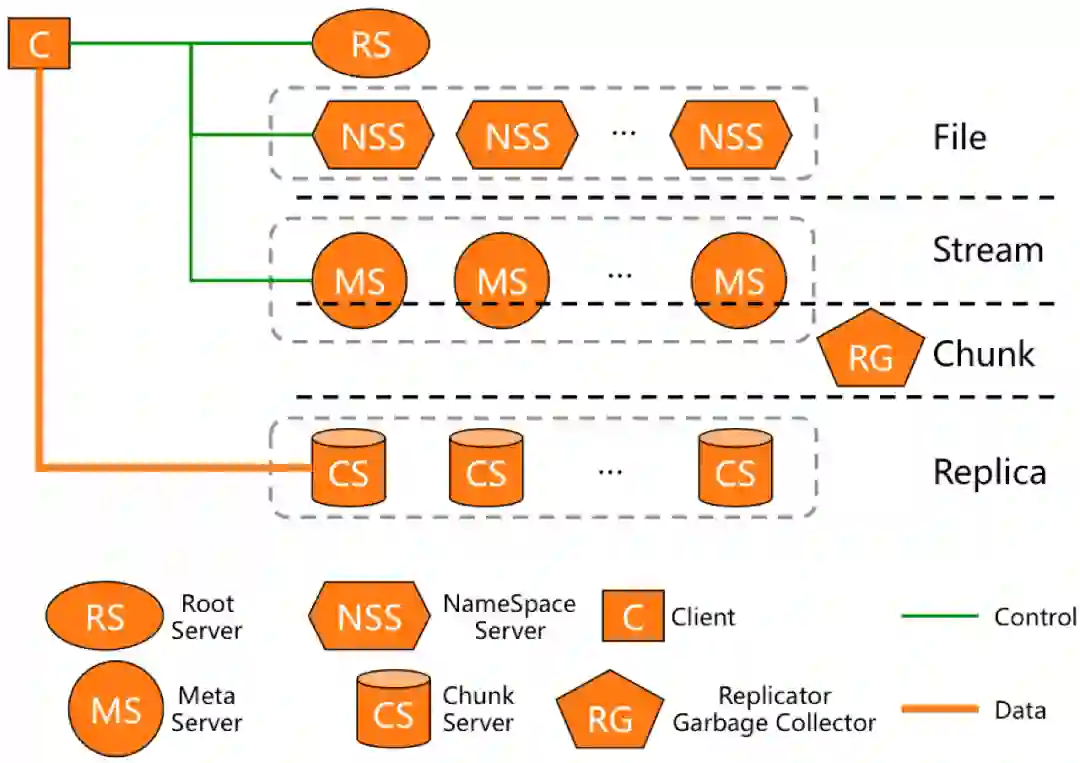 如上图描述的架构所示,各层元数据(RootServer、NameSpaceServer、MetaServer)都提供了冗余设计,故障时可以快速切换,对于数据(ChunkServer)来说通过 None-Stop-Write 特性解决服务器、磁盘故障时的快速切换,从而在分布式存储层提高可用性。