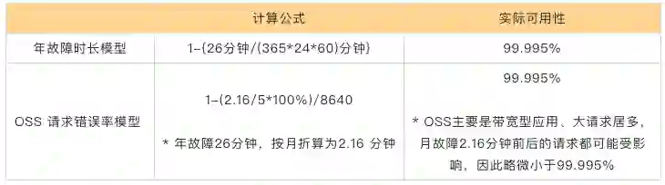 可以看出,它和年故障市场模型的可用性相同,但 OSS 上主要是带宽型应用、大请求居多,因此在故障的 2.16 分钟前后的请求都会受影响,导致可用性会稍微小于 99.995%,从某种意义上讲 OSS 的请求错误率模型略微严格。
