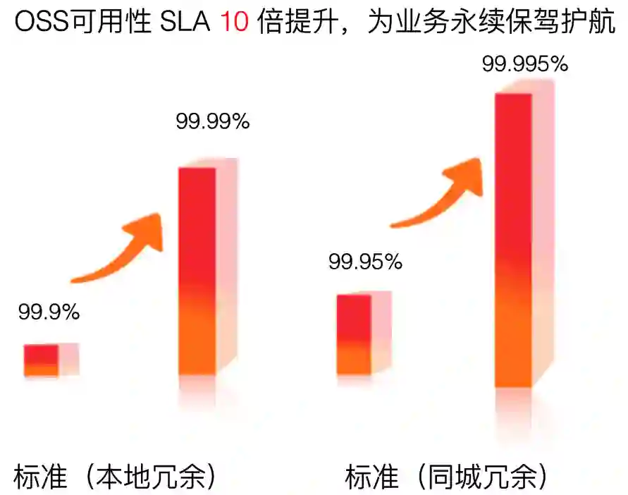 阿里云对象存储 OSS 通过十年积累的技术红利,长期在双十一淘宝应用如丝般顺滑体验需求的打磨下,2020 年 6 月将可用性 SLA 提升 10 倍,其中 OSS 标准型(同城冗余)存储,SLA 从 99.95% 提升到 99.995%,简单理解能支持 10 万张图片最多只有 5 个显示卡,下一章有详细解释。