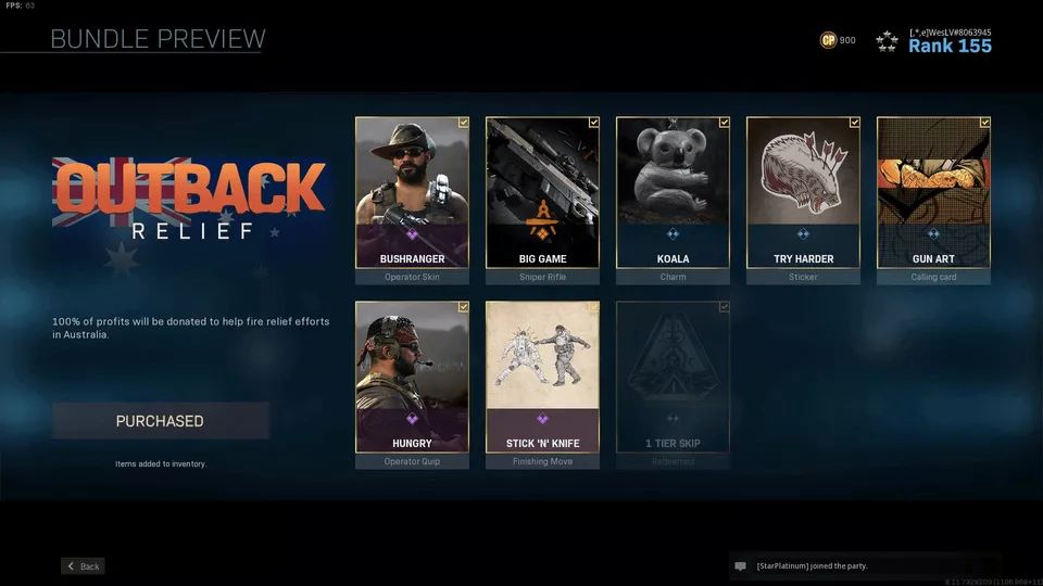 Infinity Ward 最近宣布《使命召唤16:现代战争》将推出义卖套餐「内陆赈灾包」(Outback Relief Pack),该单品的所有收入都将捐献给相关机构,帮助对抗澳大利亚山火。这款义卖包里收录的内容有:一款皮肤、一把独家狙击步枪皮肤,一款考拉主题武器涂装,免费为战斗通票升一级等等,售价为1800点券,约合20美元。