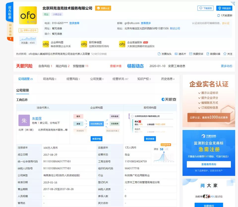 天眼查数据显示,1 月 10 日,北京拜克洛克技术服务有限公司发生工商变更,ofo 创始人戴威退出法定代表人、执行董事和经理,由朱爱莲接任。此外,张巳丁退出监事,由袁雪云接任。北京拜克洛克技术服务有限公司成立于 2017 年 8 月,注册资本 100 万人民币,戴威持有该公司 70% 的股份,为公司最大股东;联合创始人杨品杰和于信分别持股 20% 和 10%,为公司第二和第三大股东。