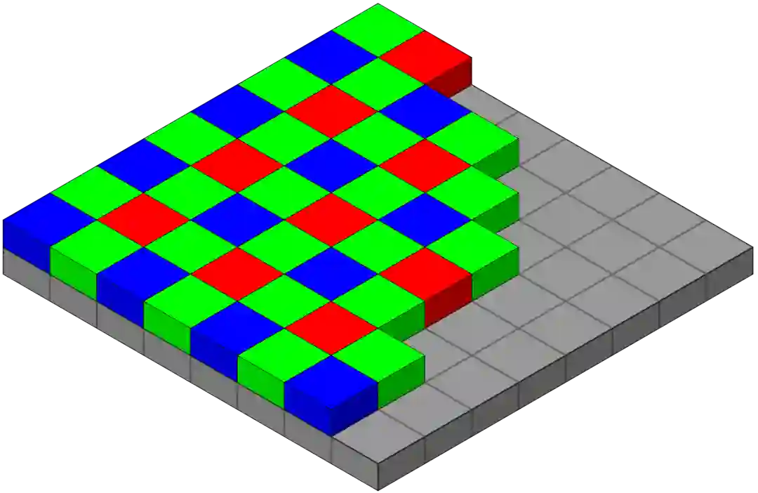 你可以将 CFA 理解为光线在到达传感器之前的一层「滤镜」,以应用最为广泛的拜尔阵列滤色镜为例,拜尔阵列以 2 个绿色像素、1 个红色像素和 1 个蓝色像素为单元,通过滤镜的光线除了能够在传感器上留下强度信息外,还能同时保留对应的色彩信息。值得注意的是,因为每个像素只过滤并记录红、绿、蓝三种颜色中的一种,这些从单个像素获取的信息其实也不能完整反映画面中不同颜色的组成方式。