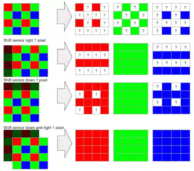 在解决数字变焦对画面进行裁剪、重建进而造成细节丢失这个问题时,Google 相机团队首先想到的切入点也是上文提到的 CFA 滤镜。不过相比于其他同行,Google 的工程师选择了 DRIZZLE —— 一种在天文摄影学中已经流行了数十年的常用拍摄技巧。DRIZZLE 通过捕捉并合成多张拍摄角度略有变化的照片,来实现 2x 甚至 3x 的数字变焦效果,基本理念是将多张低分辨率的连拍照片直接合并对齐到更高分辨率的像素网格中。具体的合并对齐流程如下:
