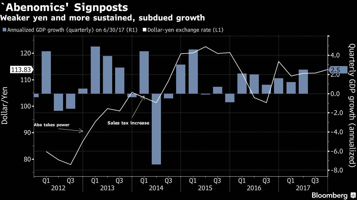 “安倍经济学”的导向作用:逐渐疲软的日元和缓慢增长的经济