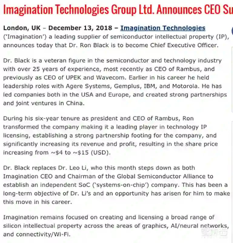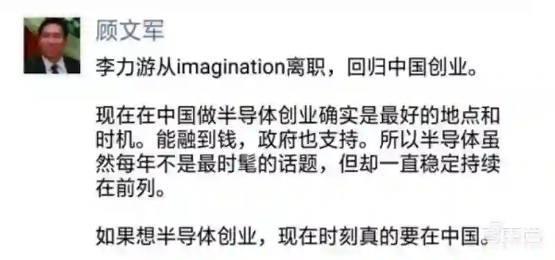 芯谋研究分析师顾文军也在朋友圈中写道,Imagination CEO李力游先生离职,回归中国创业。