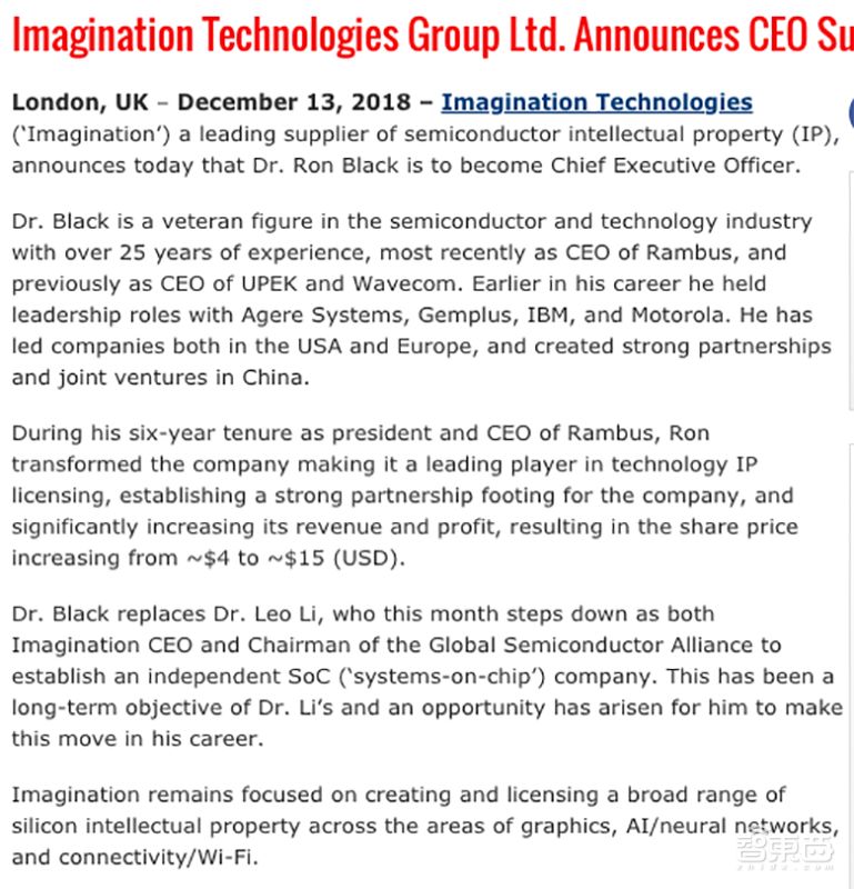 智东西12月14日消息,Imagination已于英国时间13日发公告宣布李力游(Dr. Leo Li)在本月辞去该公司CEO和全球半导体联盟主席的职务,由Ron Black博士接任公司CEO。