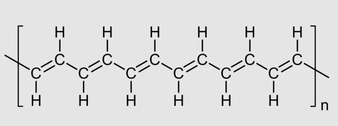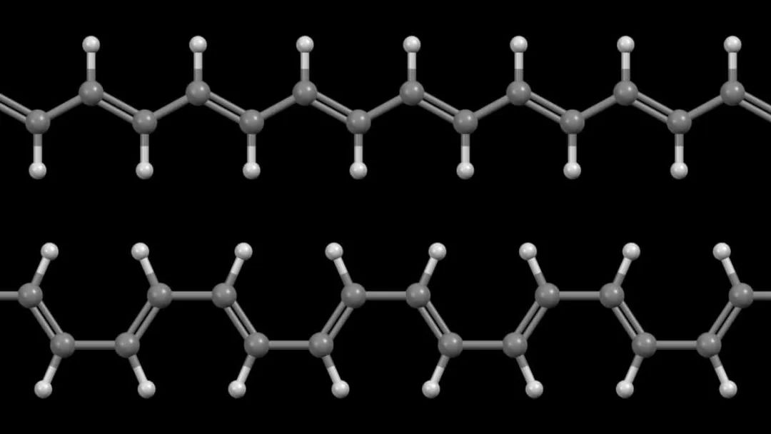 聚乙炔中的原子通过共价键结合在一起。单键意味着两个原子共用一个外层电子,双键表示共用两个电子。聚乙炔链中碳原子之间的单键和双键交替,使得该分子成为物理化学中一个有趣的研究对象。