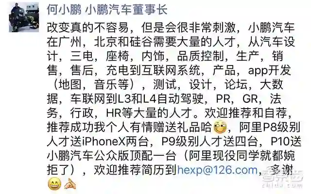“小鹏汽车在广州、北京和硅谷需要大量人才。欢迎推荐和自荐,推荐成功我个人友情赠送礼品哈。阿里P8级人才送iPhoneX两台,P9级别人才送4四,P10送小鹏汽车公众版顶配一台。”为了招人,何小鹏的朋友圈里直接写出了有奖推荐政策。