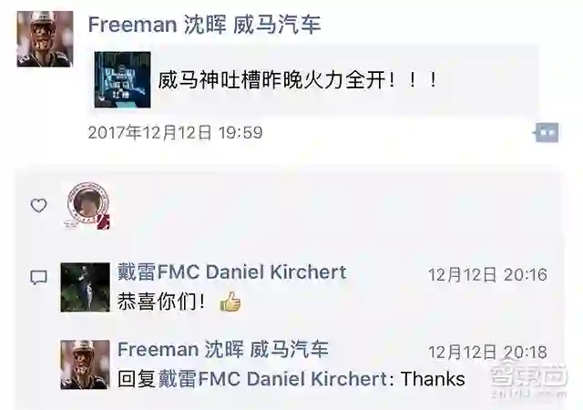 “恭喜你们!”FMC拜腾汽车总裁戴雷在这条朋友圈下面写到。“Thanks”沈晖回复。