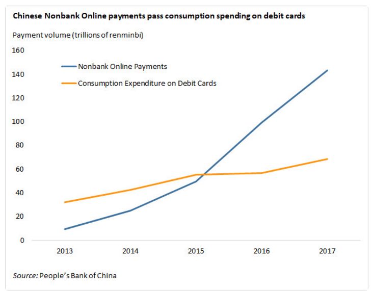 Nonbank online payment systems like Alipay were thus almost a decade old when regulations came into play; by that time, they had reached critical mass thanks to network effects and the hundreds of millions of Chinese using smartphones, driving a shift from online to mobile payments. Nonbank online payments were catapulted into the world spotlight in 2013, when providers in China processed RMB 9.2 trillion in transactions (see figure below). Also in 2013, Alipay surpassed PayPal (link is external) to become the world’s largest online payment platform. It is difficult to quantify growth before 2013, the first year for which there are official data on online payments volumes, because Alibaba and Tencent keep tight wraps on their data. Nonbank online payments grew at almost 170 percent in 2014, and soon after exceeded consumption spending on China’s 5 billion or so debit cards.