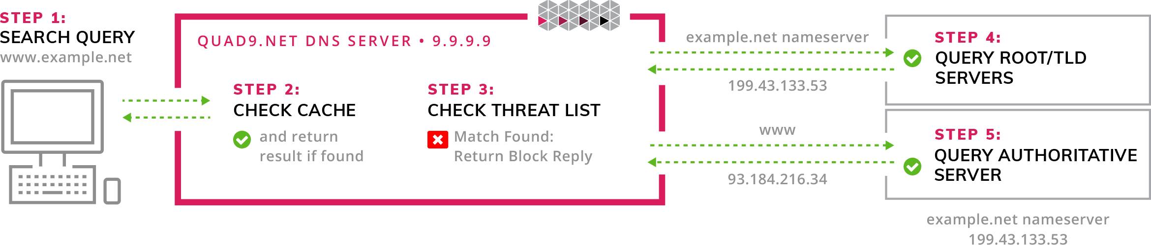 Quad9 会阻止已知的恶意网域,阻止您的计算机和物联网设备连接恶意软件或网络钓鱼网站。无论何时,一个 Quad9 用户点击网站链接或输入地址到网页浏览器时,Quad9 将该网站与 IBM X-Force 威胁情报数据库中的 400 多亿个网页和图像想对比。 Quad9 还可以从 18 个额外的威胁情报合作伙伴那里获取信息,以阻止最终用户和企业风险面临的大部分威胁。