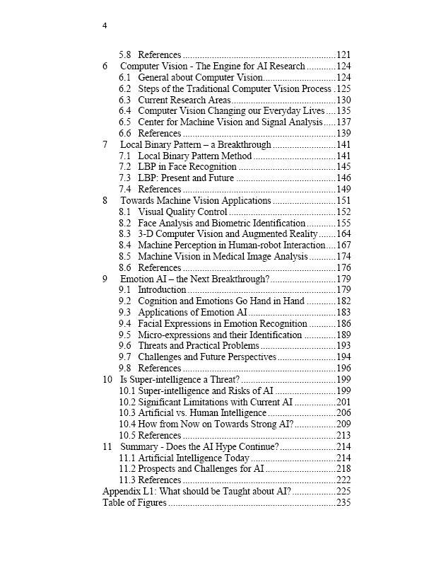 这本书的目的是给人工智能的现实图景,它的历史,它的潜力和局限性。我们相信人工智能是人类的助手,而不是统治者。我们首先描述什么是人工智能,以及它在过去几十年里是如何发展的。在基本原理之后,我们解释了海量数据对于当前主流人工智能的重要性。本文涵盖了人工智能、方法和机器学习的最常见表示。此外,还介绍了主要的应用领域。计算机视觉一直是人工智能发展的核心。这本书提供了计算机视觉的一般介绍,并包括对我们自己的研究的结果和应用的展示。情感是人类智能的核心,但在人工智能中却鲜有应用。我们将介绍情商的基础知识以及我们自己在这一主题上的研究。我们将讨论超越人类理解的超级智能,解释为什么在现有知识的基础上,这种成就似乎是不可能的,以及如何改进人工智能。最后,总结了人工智能的现状和未来要做的事情。在附录中,我们回顾了人工智能教育的发展,特别是从我们自己大学的内容的角度。