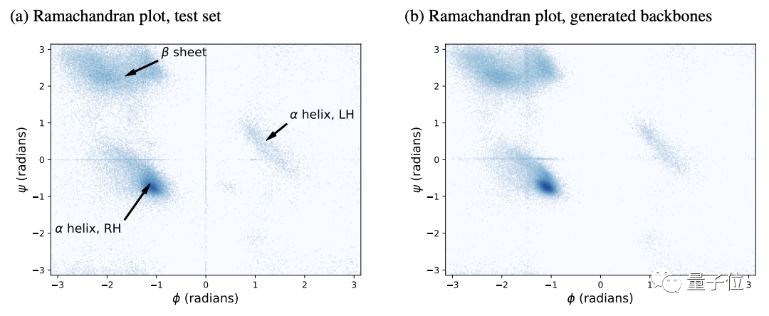 如下图Ramachandran plot(拉氏图,专门用于检测蛋白质构象是否合理)所示,左右分别为测试集和生成的蛋白质主干的(φ,ψ)二面角。